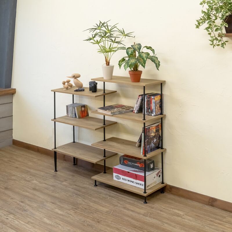 スリムなスチールフレームとヴィンテージテイストの木目調天板を組み合わせた、「見せる収納」を楽しむことができるオープンラック。